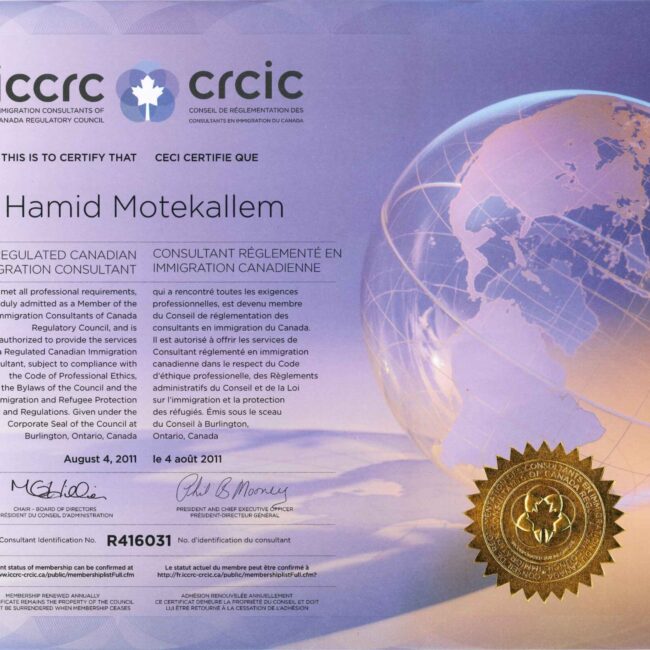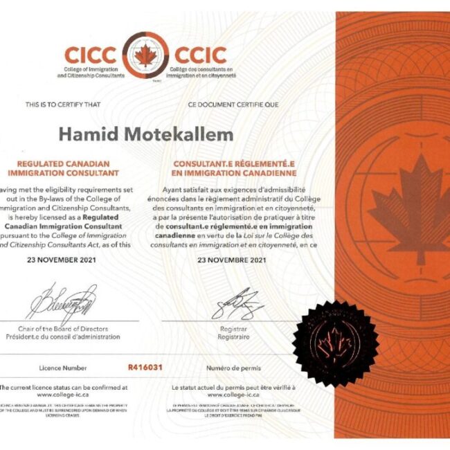 Hamid Motekallem, the president of Cangates, Immigration and Citizenship Consulting, is a registered Canadian immigration Consultant (with many years of experience in Immigration and Citizenship Law services)who has graduated from Toronto Humber College with High Honours and is a member of The College of